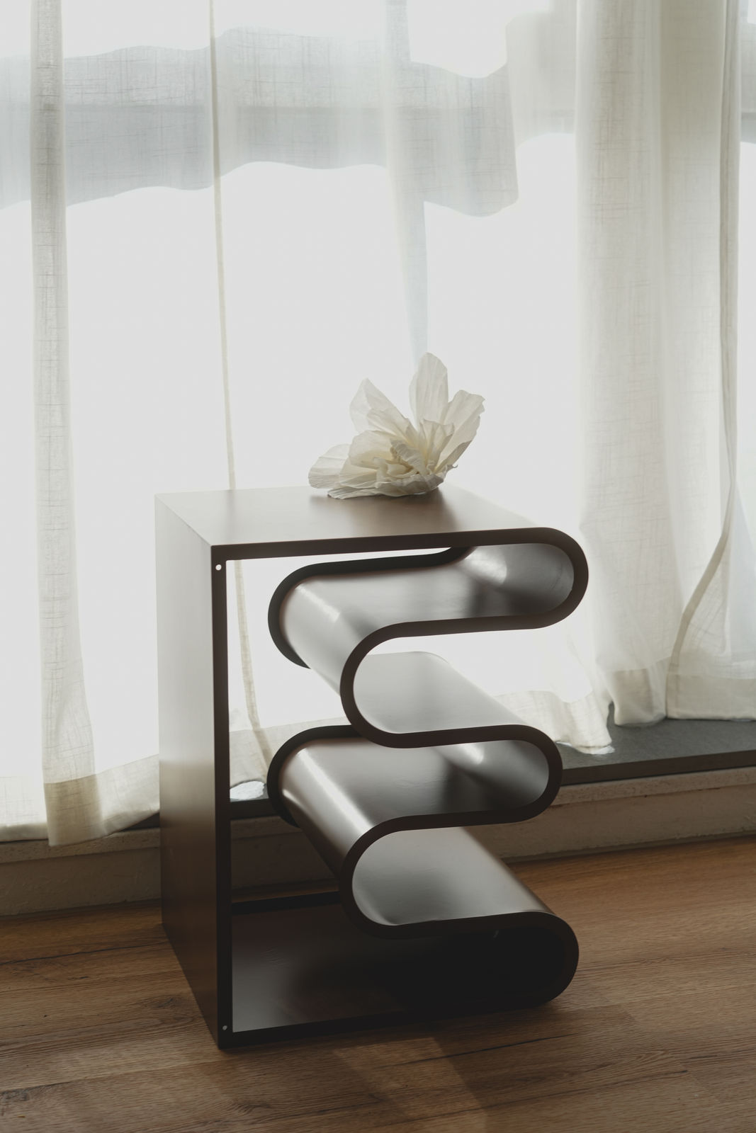 Der warme Holzfußboden bringt Wohnlichkeit in die industrielle Architektur und sorgt für eine zeitlose, harmonische Atmosphäre.