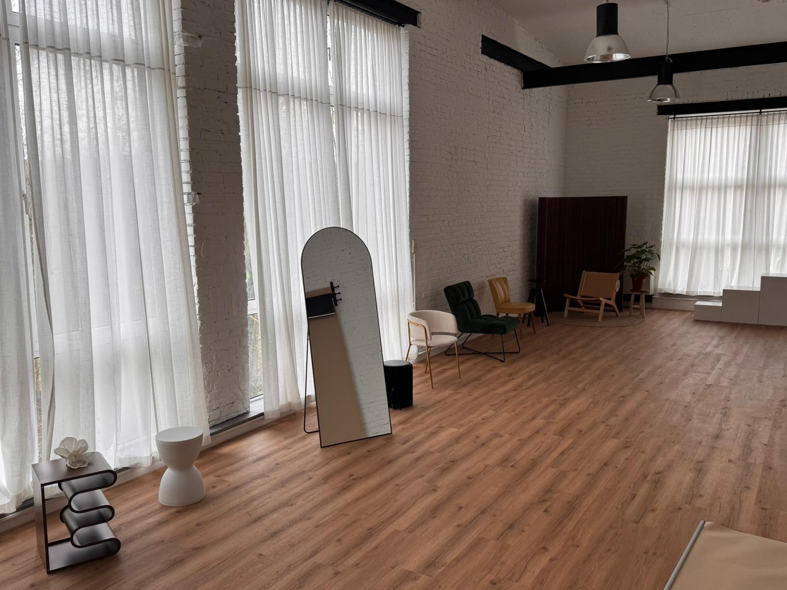 Auf über 100 Quadratmetern entfaltet sich eine offene Raumstruktur mit beeindruckender Deckenhöhe von mehr als sechs Metern. Drei außergewöhnlich große Fenster mit rund vier Metern Höhe fluten das Studio mit natürlichem Licht und schaffen ideale Bedingungen für authentische Foto- und Videoaufnahmen.